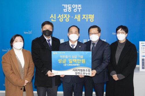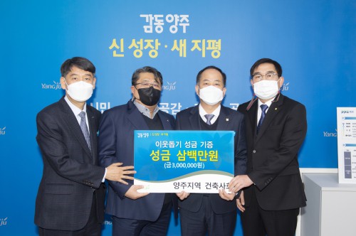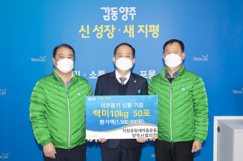 ½Ã¿¡ µû¸£¸é Áö³ 25ÀÏ Á÷Àå°øÀå »õ¸¶À»¿îµ¿ ¾çÁÖ½ÃÇùÀÇȸ(ȸÀå ¿À¼ö¿µ)¿¡¼ ¹é¹Ì 10kg 50Æ÷, ¾çÁÖÁö¿ª °ÇÃà»çȸ(°¨¸®ÇùȸÀå °¼º¿µ, °ÇÃà»çÇùȸÀå ±è³²¿µ)¿¡¼ ¼º±Ý 300¸¸¿ø, »çȸÀûÇùµ¿Á¶ÇÕ ¾çÁÖµµ¿ì´©¸®(ÀÌ»çÀå ¸ÍµÎ¿)¿¡¼ ¼º±Ý 100¸¸¿øÀ» ±âŹÇß´Ù.