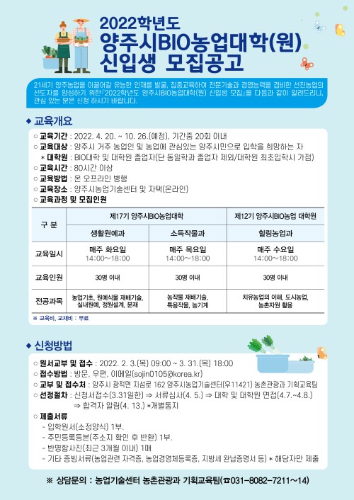 ¾çÁÖ½Ã(½ÃÀå À̼ºÈ£)´Â ¾çÁÖ ¹Ì·¡³ó¾÷À» ¼±µµÇÒ Àü¹®±â¼ú°ú °æ¿µ´É·ÂÀ» °âºñÇÑ ÀÎÀ縦 ÁýÁß À°¼ºÇϱâ À§ÇØ ¿À´Â 2¿ù 3ÀϺÎÅÍ 3¿ù 31ÀϱîÁö 'Á¦17±â ¾çÁÖ½ÃBIO³ó¾÷´ëÇÐ', 'Á¦12±â ¾çÁÖ½ÃBIO³ó¾÷´ëÇпø'À» °³¼³ÇÏ°í ½ÅÀÔ»ýÀ» ¸ðÁýÇÑ´Ù.