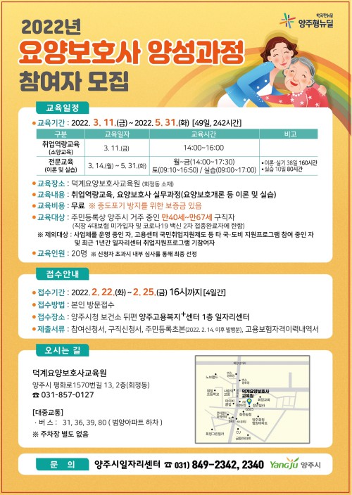 ¾çÁÖ½ÃÀÏÀÚ¸®¼¾ÅÍ´Â ¿À´Â 22ÀϺÎÅÍ 25ÀϱîÁö 2022³â Ãë¾÷Áö¿øÇÁ·Î±×·¥ÀÎ ‘¿ä¾çº¸È£»ç ¾ç¼º°úÁ¤’¿¡ Âü¿©ÇÒ ±³À°»ýÀ» ¸ðÁýÇÑ´Ù.