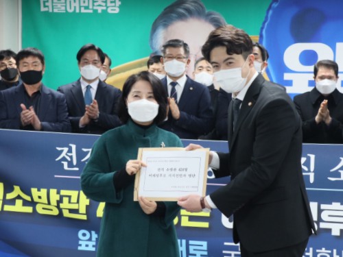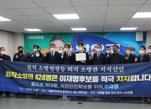 ÃÊ´ë ¼Ò¹æÃ»Àå°ú Àü ½Ã·µµ ¼Ò¹æº»ºÎÀå·¼Ò¹æ¼Àå µî ÀüÁ÷ ¼Ò¹æ°ø¹«¿ø 424¸íÀº Áö³ 1¿ù 27ÀÏ ´õºÒ¾î¹ÎÁÖ´ç ´ç»ç¿¡¼ ´õºÒ¾î¹ÎÁÖ´ç ÀÌÀç¸í Èĺ¸ ÁöÁö¸¦ ¼±¾ðÇß´Ù.