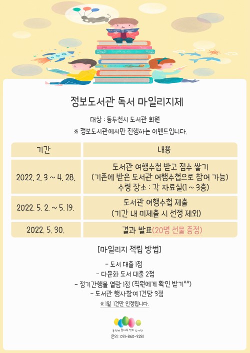 µ¿µÎõ½Ã ²Þ³ª¹«Á¤º¸µµ¼°üÀº ¿À´Â 2¿ù 14ÀϺÎÅÍ 4¿ù 28ÀϱîÁö µ¶¼È°¼ºÈ¸¦ À§ÇØ µµ¼°ü Á¤È¸¿øÀ» ´ë»óÀ¸·Î ¸¶Àϸ®ÁöÁ¦¸¦ ¿î¿µÇÑ´Ù.