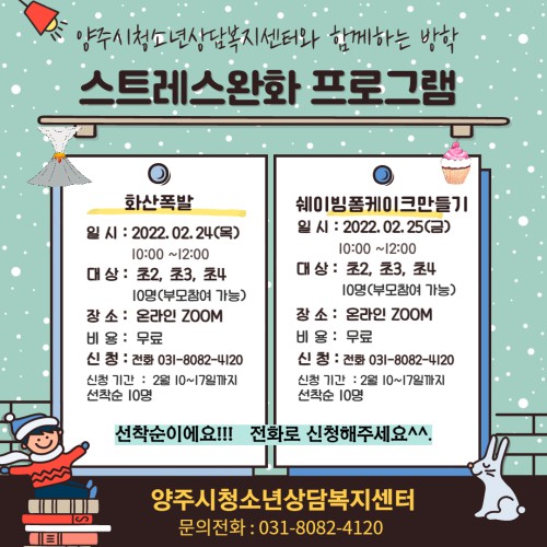 ¾çÁÖ½Ãû¼Ò³â»ó´ãº¹Áö¼¾ÅÍ(¼¾ÅÍÀå ÀÌ»óÇö)´Â ¿À´Â 17ÀϱîÁö °ü³» û¼Ò³âÀ» ´ë»óÀ¸·Î ÁøÇàÇÏ´Â °Ü¿ï¹æÇÐ Áý´Ü»ó´ã‘ ½ºÆ®·¹½º ¿ÏÈ ÇÁ·Î±×·¥’ Âü°¡ÀÚ¸¦ ¸ðÁýÇÑ´Ù°í ¹àÇû´Ù.