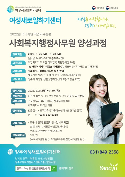 ¾çÁÖ¿©¼º»õ·ÎÀÏÇϱ⼾ÅÍ´Â ¿À´Â 3¿ù 10ÀϱîÁö °æ·Â´ÜÀý ¿©¼ºÀ» ´ë»óÀ¸·Î Á÷¾÷±³À°ÈÆ·Ã ‘»çȸº¹ÁöÇàÁ¤»ç¹«¿ø ¾ç¼º°úÁ¤’¿¡ Âü¿©ÇÒ ¼ö°»ýÀ» ¸ðÁýÇÑ´Ù.