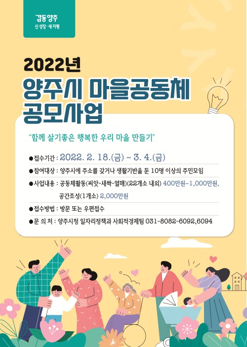 ¾çÁÖ½Ã(½ÃÀå À̼ºÈ£)°¡ Áö¿ªÁÖ¹ÎÀÇ ¼ÒÅë Ȱ¼ºÈ¸¦ ÅëÇÑ ÀÚÄ¡¿ª·®À» °ÈÇϱâ À§ÇØ ‘2022³â ¸¶À»°øµ¿Ã¼ Áö¿ø»ç¾÷’À» °ø¸ðÇÑ´Ù.