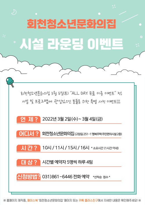 ȸõû¼Ò³â¹®ÈÀÇÁýÀº ¿À´Â 3¿ù 2ÀϺÎÅÍ 4ÀϱîÁö 3Àϰ£ Áö¿ª û¼Ò³â°ú ÁÖ¹ÎÀ» ´ë»óÀ¸·Î ±â°ü ³» ½Ã¼³À» µÑ·¯º¸°í ¿î¿µ ¿¹Á¤ÀÎ ÇÁ·Î±×·¥À» ¼³¸íÇÏ´Â ‘½Ã¼³ ¶ó¿îµù’ Çà»ç¸¦ ÃßÁøÇÑ´Ù.