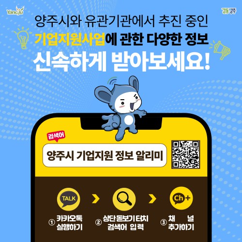 ¾çÁÖ½Ã(½ÃÀå À̼ºÈ£)´Â Áß¼Ò±â¾÷ÀÇ ¾Ö·Î»çÇ×À» ÇØ°áÇÏ°í ½Å¼ÓÇÑ Á¤º¸ Àü´ÞÀ» À§ÇØ ‘¾çÁֽà ±â¾÷Áö¿ø Á¤º¸ ¾Ë¸®¹Ì’ īī¿ÀÅå ä³ÎÀ» °³¼³Çß´Ù.