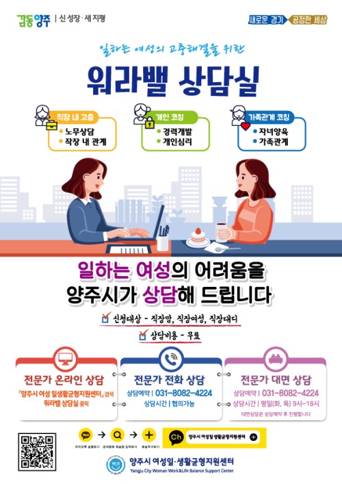 ¾çÁֽà ¿©¼ºÀÏ»ýȰ±ÕÇüÁö¿ø¼¾ÅÍ´Â °ü³» Á÷À帾·Á÷Àå¿©¼ºÀ» ´ë»óÀ¸·Î Á÷Àå ³» °íÃæ ÇØ°áÀ» À§ÇÑ ³ëµ¿»ó´ã°ú »î¿¡ ´ëÇÑ °í¹ÎÀ» Åоî³õÀ» ¼ö ÀÖ´Â ¿ö¶ó¹ë »ó´ã½ÇÀ» ¹«·á·Î ¿î¿µÇÑ´Ù.