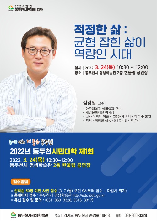 µ¿µÎõ½Ã´Â ¿À´Â 3¿ù 24ÀÏ ¿ÀÀü 10½Ã 30ºÐºÎÅÍ µ¿µÎõ½Ã Æò»ýÇнÀ°ü 2Ãþ °ø¿¬Àå¿¡¼ ¾ÆÁÖ´ëÇб³ ½É¸®ÇÐ ±³¼ö ±è°æÀÏ °»ç¸¦ ÃÊÃ»ÇØ “ÀûÁ¤ÇÑ »î : ±ÕÇü ÀâÈù »îÀÌ ¿ª·®ÀÎ ½Ã´ë”¶ó´Â ÁÖÁ¦·Î 2022³â Á¦1ȸ µ¿µÎõ½Ã¹Î´ëÇÐÀ» °³ÃÖÇÑ´Ù.