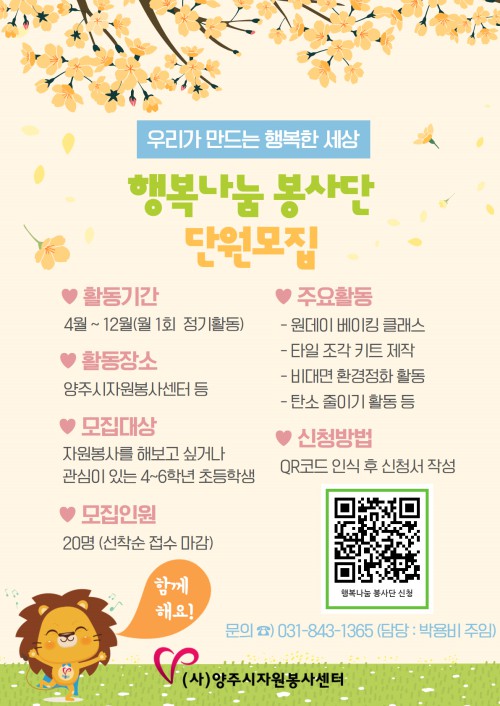 ºÀ»ç´Ü Âü¿©¸¦ Èñ¸ÁÇÏ´Â ÇлýÀº ¾çÁÖ½ÃÀÚ¿øºÀ»ç¼¾ÅÍ È¨ÆäÀÌÁö ¶Ç´Â È«º¸ ¾È³»¹® QRÄڵ带 ÅëÇØ ¸ðÁý ½Åû¼¸¦ ÀÛ¼ºÇØ Á¦ÃâÇÏ¸é µÈ´Ù.