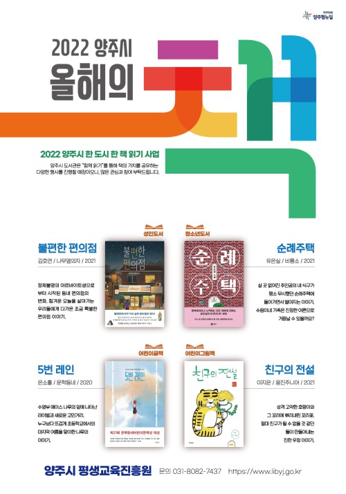 2022³â ¾çÁÖ ¿ÃÇØÀÇ Ã¥À¸·Î ¼±Á¤µÈ µµ¼´Â ÀϹݵµ¼ ‘ºÒÆíÇÑ ÆíÀÇÁ¡’, û¼Ò³âµµ¼ ‘¼ø·ÊÁÖÅÃ’, ¾î¸°À̱ÛÃ¥ ‘5¹ø ·¹ÀÎ’, ¾î¸°À̱׸²Ã¥ ‘Ä£±¸ÀÇ Àü¼³’ µî ÃÑ 4±ÇÀ¸·Î Åä·ÐÀ» ÁøÇàÇÏ°í ½ÍÀº 1~2Á¾ÀÇ Ã¥À» ¼±ÅÃÇØ ½ÅûÇÏ¸é µÈ´Ù.