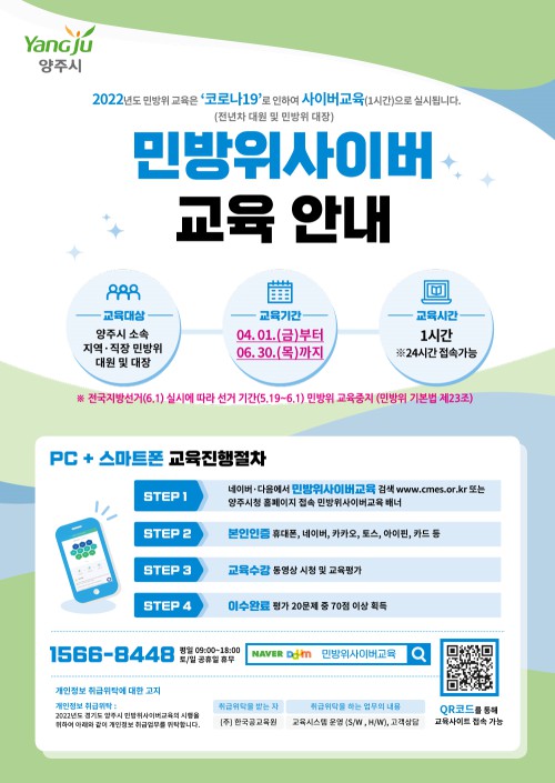 ´ë»óÀÚ´Â ¹Î¹æÀ§»çÀ̹ö±³À° ȨÆäÀÌÁö¿¡ Á¢¼ÓÇØ º»ÀÎÀÎÁõÀ» °ÅÃÄ ±³À° µ¿¿µ»óÀ» 1½Ã°£°¡·® ½ÃûÇÑ ÈÄ °´°ü½Ä Æò°¡½ÃÇè¿¡¼ 70Á¡ ÀÌ»ó Á¡¼ö¸¦ ÃëµæÇÏ¸é ±³À° À̼ö·Î ÀÎÁ¤µÈ´Ù.
