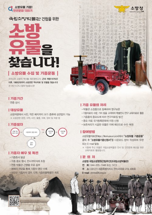 ¼Ò¹æÀ¯¹°ÀÇ ±âÁõÀº ±¹¹Î ´©±¸³ª Âü¿©ÇÒ ¼ö ÀÖÀ¸¸ç, ½Åû¹æ¹ýÀº ¼Ò¹æÀ¯¹° ÀÚ·á°ü ȨÆäÀÌÁö(http://firemuseum.or.kr)¿¡¼ ½Åû¼½ÄÀ» ´Ù¿î¹Þ¾Æ ÀÛ¼º ÈÄ ¿ìÆí ¶Ç´Â À̸ÞÀÏ·Î ¹ß¼ÛÇÏ¸é µÈ´Ù. ±×¸®°í À¯¹° ±âÁõ ÀýÂ÷ ¹× 󸮿¡ °üÇÑ ÀÚ¼¼ÇÑ ³»¿ëÀº ¼Ò¹æÀ¯¹° ÀÚ·á°ü ȨÆäÀÌÁö ‘¼ÒÀåÀ¯¹° ±âÁõ¿îµ¿’ Ç׸ñ¿¡¼ È®ÀÎÇÒ ¼ö ÀÖ´Ù.