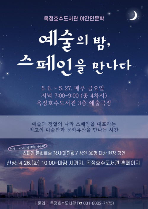 ¾çÁֽà ¿ÁÁ¤È£¼öµµ¼°üÀº ¿À´Â 5¿ù 6ÀϺÎÅÍ 27ÀϱîÁö ¾ß°£Àι®ÇÐ ÇÁ·Î±×·¥‘¿¹¼úÀÇ ¹ã, ½ºÆäÀÎÀ» ¸¸³ª´Ù’¿¡ Âü¿©ÇÒ ¼ö°»ý 30¸íÀ» ¸ðÁýÇÑ´Ù.