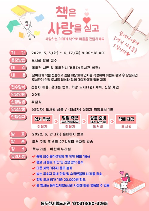 ‘Ã¥Àº »ç¶ûÀ» ½Æ°í’ Çà»ç´Â 5¿ù 3ÀϺÎÅÍ 6¿ù 17ÀϱîÁö ÁøÇàÇϸç, 20¸íÀÇ ½ÅûÀÚ¸¦ Ãß÷ÇÏ¿© 6¿ù 21ÀÏ È¿äÀÏ¿¡ ½Ã¸³µµ¼°ü ȨÆäÀÌÁö¿¡ ¹ßÇ¥ÇÑ´Ù. µ¿µÎõ ½Ã¹Î ȤÀº °ÅÁÖÀÚ¿¡ ÇÑÇØ Âü¿© °¡´ÉÇϸç, Èñ¸Á µµ¼´Â Á¤°¡ ±âÁØ 20,000¿ø ÇѵµÀÌ´Ù. µµ¼´Â 6¿ù 27ÀϺÎÅÍ ¼øÂ÷ÀûÀ¸·Î ¹ß¼ÛÇÒ ¿¹Á¤ÀÌ´Ù.