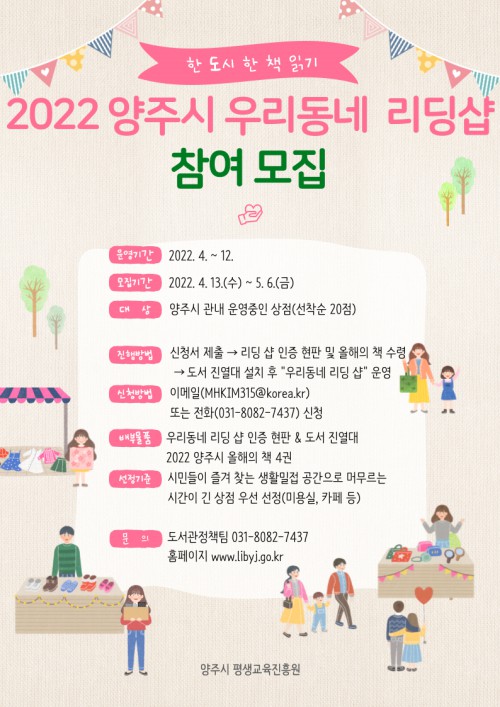 ¾çÁÖ½Ã(½ÃÀå ±ÇÇÑ´ëÇà ±èÁ¾¼®)°¡ Ã¥ Àд ½Ã¹Î¹®È Á¤Ã¥ÀÇ ÀÏȯÀ¸·Î ¾çÁÖ ¿ÃÇØÀÇ Ã¥À» Ȱ¿ëÇÑ ‘¾çÁÖ ¿ì¸®µ¿³× ¸®µù¼¥(READING SHOP)’¿¡ Âü¿©ÇÒ »óÁ¡ÁÖ¸¦ ¸ðÁýÇÑ´Ù.
