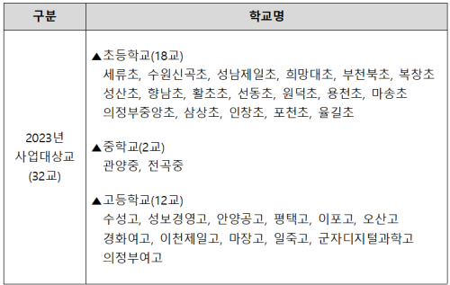 2023³âµµ »ç¾÷ ´ë»ó Çб³´Â ÃÑ 32±³·Î ÃʵîÇб³ 18±³, ÁßÇб³ 2±³, °íµîÇб³ 12±³ °Ç¹° 58µ¿ÀÌ´Ù.