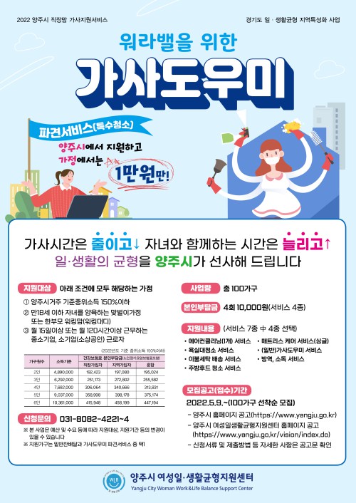 Á÷À帾 °¡»çÁö¿ø¼ºñ½º´Â ÀÚ³à¾çÀ°°ú »çȸȰµ¿À» º´ÇàÇÏ´Â Àú¼Òµæ ¿öÅ·¸¾ °¡Á¤¿¡ û¼Ò, ¼¼Å¹, ¹Ø¹ÝÂù ¸¸µé±â µîÀÇ ¼ºñ½º¸¦ Á¦°øÇØ °¡»çºÎ´ã °æ°¨°ú »ýȰ¾ÈÁ¤À» µµ¸ðÇϰíÀÚ ¸¶·ÃµÈ ÀÏ·°¡Á¤ ¾ç¸³Áö¿ø »ç¾÷ÀÌ´Ù.