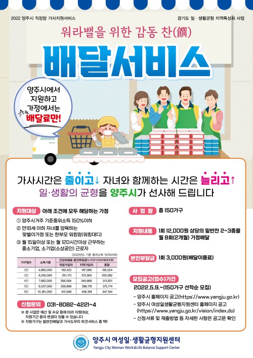 ‘ã¾Æ°¡´Â ¹Ø¹ÝÂù Áö¿ø¼ºñ½º’´Â ÁÖ 2ȸ 2°³¿ù°£ 12,000¿ø »ó´çÀÇ ¹Ø¹ÝÂù 2~3Á¾À» ´ë»ó °¡Á¤¿¡ ¹è´ÞÇÏ´Â »ç¾÷À¸·Î ÃÑ 150°¡±¸¸¦ ´ë»óÀ¸·Î ÁøÇàÇÑ´Ù.