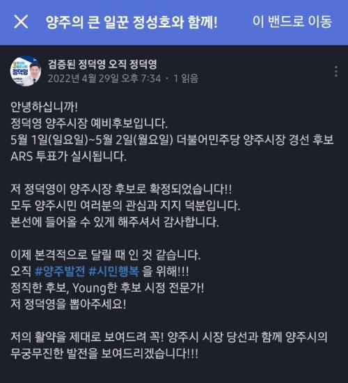 Á¤´ö¿µ ´õºÒ¾î¹ÎÁÖ´ç ¾çÁÖ½ÃÀå È帰¡ °æ¼±(5¿ù1~2ÀÏ)ÀÌ ½Ç½ÃµÇ±â Àü(4¿ù29ÀÏ) º»ÀÎÀÇ ÆäÀ̽ººÏ ¹× Á¤¼ºÈ£ ±¹È¸ÀÇ¿ø ³×À̹ö ¹êµå¿¡ “½ÃÀå Èĺ¸·Î È®Á¤µÅ º»¼±¿¡ ÁøÃâÇÏ°Ô µÆ´Ù”´Â ÇãÀ§»ç½ÇÀ» °øÇ¥ÇÏ¿© ‘³»Á¤¼³’ µîÀ» À¯¹ßÇÑ °¡¿îµ¥, ¹ÚÀ縸 ¿¹ºñÈĺ¸¿¡ À̾î ÀÌÈñâ ¿¹ºñÈ帵µ Àç½ÉÀ» û±¸Çß´Ù.