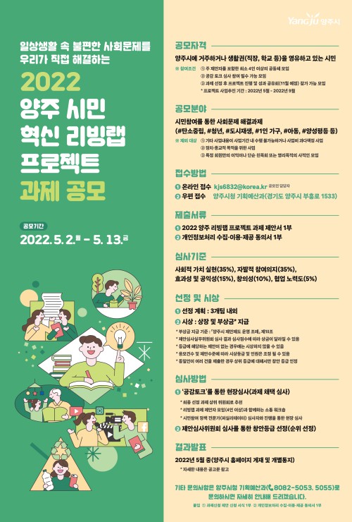 ¾çÁÖ½Ã(½ÃÀå ±ÇÇÑ´ëÇà ±èÁ¾¼®)°¡ ¿À´Â 13ÀϱîÁö ‘2022 ¾çÁֽùΠÇõ½Å ¸®ºù·¦ ÇÁ·ÎÁ§Æ®’ °úÁ¦¸¦ °ø¸ðÇÑ´Ù.