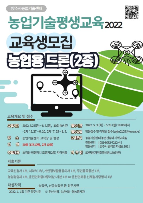 ¾çÁÖ½Ã(¾çÁÖ½ÃÀå ±ÇÇÑ´ëÇà ±èÁ¾¼®)´Â ¿À´Â 23ÀϱîÁö ³ó¾÷¿ë µå·Ð ÀÚ°ÝÁõ ÃëµæÀ» Èñ¸ÁÇÏ´Â ±³À°»ý 20¸íÀ» ¸ðÁýÇÑ´Ù.