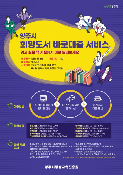 ¾çÁֽùÎÀ̶ó¸é ´©±¸³ª ÀÌ¿ëÇÒ ¼ö ÀÖÀ¸¸ç ¾çÁֽà µµ¼°ü ȨÆäÀÌÁö¿¡ Á¢¼ÓÇØ Èñ¸Áµµ¼¸¦ ½ÅûÇÏ°í ´ëÃâ ½ÂÀÎ ¾È³» ¹®ÀÚ¸¦ ¼ö½Å ÈÄ Áö¿ª¼Á¡À» ¹æ¹®ÇÏ¸é µÈ´Ù.