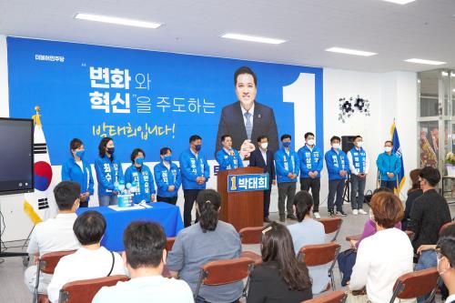 °æ±âµµÀÇ¿ø ¾çÁֽà Á¦2¼±°Å±¸(ÀºÇö¸é, ³²¸é, ȸõ1~4µ¿)¿¡¼ Àç¼±¿¡ µµÀüÇÏ´Â ¹ÚÅÂÈñ ´õºÒ¾î¹ÎÁÖ´ç È帰¡ 5¿ù14ÀÏ ¼±°Å»ç¹«¼Ò °³¼Ò½ÄÀ» ¿°í º»°ÝÀûÀÎ ¼±°Å¿îµ¿¿¡ µ¹ÀÔÇß´Ù.