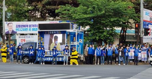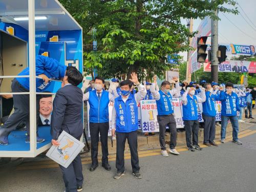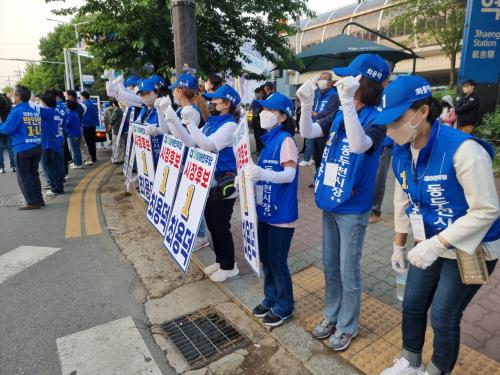ÃÖ¿ë´ö ´õºÒ¾î¹ÎÁÖ´ç µ¿µÎõ½ÃÀå È帴 5¿ù19ÀÏ ¿ÀÈÄ 6½Ã30ºÐ ÁöÇ࿪ ¾Õ¿¡¼ ½Ã¹ÎµéÀÇ Åð±Ù ½Ã°£¿¡ ¸ÂÃç ÃâÁ¤½ÄÀ» ¿°í “ÇÑ ¹ø ´õ ÃÖ¿ë´ö”À» ¿ÜÄ¡¸ç ÁöÁö¸¦ È£¼ÒÇß´Ù.