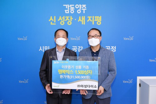 ¾çÁÖ½Ã(¾çÁÖ½ÃÀå ±ÇÇÑ´ëÇà ±èÁ¾¼®)´Â Áö³ 23ÀÏ (ÁÖ)¾Æ¼º´ÙÀ̼Ò(º»ºÎÀå ±è¹éö)¿¡¼ ½ÃûÀ» ¹æ¹®ÇØ °¡Á¤ÀÇ ´ÞÀ» ¸Â¾Æ Çູ¹Ú½º 1,500»óÀÚ¸¦ Àü´ÞÇß´Ù°í ¹àÇû´Ù.