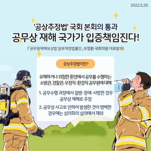 ¿À¿µÈ¯ ±¹È¸ÀÇ¿ø(´õºÒ¾î¹ÎÁÖ´ç, ÀÇÁ¤ºÎ½Ã °©)ÀÌ ´ëÇ¥ ¹ßÀÇÇÑ ¡¸°ø¹«¿øÀçÇØº¸»ó¹ý ÀϺΰ³Á¤¹ý·ü¾È¡¹, À̸¥¹Ù ‘°ø»óÃßÁ¤¹ý’ÀÌ 29ÀÏ ±¹È¸ º»È¸ÀǸ¦ Åë°úÇß´Ù.