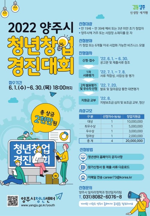¾çÁÖ½Ã(¾çÁÖ½ÃÀå ±ÇÇÑ´ëÇà ±èÁ¾¼®)´Â ¿À´Â 6¿ù 30ÀϱîÁö ‘2022 û³ââ¾÷ °æÁø´ëȸ’¿¡ Âü¿©ÇÒ Ã»³â â¾÷°¡¸¦ ¸ðÁýÇÑ´Ù°í ¹àÇû´Ù.