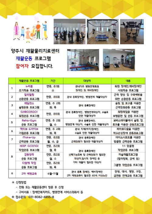 ¾çÁÖ½Ã(½ÃÀå ±ÇÇÑ´ëÇà ±èÁ¾¼®)´Â Áö³´Þ Àº³²ÅëÇÕº¸°ÇÁö¼Ò¿¡ °³¼ÒÇÑ ÀçȰ¹°¸®Ä¡·á¼¾ÅÍ¿¡¼ ÁøÇàÇÏ´Â Àü¹® ÀçȰ¿îµ¿ ÇÁ·Î±×·¥ ‘Áö¿ª»çȸÁß½ÉÀçȰ»ç¾÷’¿¡ Âü¿©ÇÒ ±³À°»ýÀ» ¸ðÁýÇÑ´Ù.
