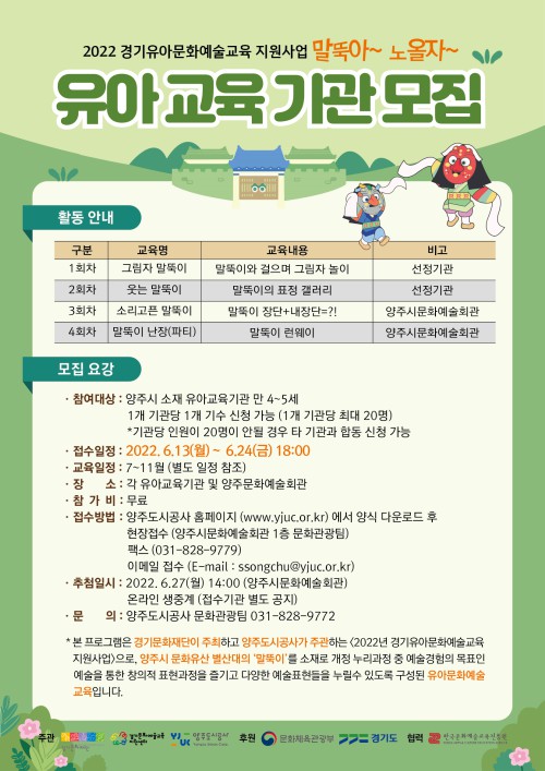 ¾çÁÖµµ½Ã°ø»ç´Â 2022³â °æ±â À¯¾Æ ¹®È¿¹¼ú±³À° Áö¿ø»ç¾÷¿¡ ¼±Á¤µÇ¾î ¿À´Â 7¿ù 5ÀϺÎÅÍ 11¿ù 24ÀϱîÁö “¸»¶Ò¾Æ~³ë¿ÃÀÚ~”¶ó´Â À¯¾Æ ¹®È¿¹¼ú ±³À°ÇÁ·Î±×·¥À» ¿î¿µÇÑ´Ù°í ¹àÇû´Ù.