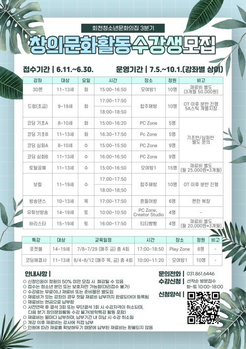 âÀǹ®ÈȰµ¿Àº ¾çÁֽÿ¡ °ÅÁÖ ÁßÀÎ 8~19¼¼ û¼Ò³âµéÀ» ´ë»óÀ¸·Î Á¤±Ô°ÁÂ¿Í Æ¯º°°Á ¼ö°»ýÀ» ¸ðÁýÇϰí ÀÖ´Ù. ¸ðÁý ÁßÀÎ Á¤±Ô°Á´ 3DÆæ, µå·³(ÃʱÞ), ÄÚµù(±âÃÊ, ½ÉÈ), ÅäÅ»°ø¿¹, º¸ÄÃ, ¹æ¼Û´í½º, À¯Æ©ºê¹æ¼Û, ¹Ù¸®½ºÅ¸À̸ç, Ưº°°Á·δ Æ÷ÄϺ¼°ú ÄÚµùÇØ°á»ç°¡ ÀÖ´Ù. ¼ö°·á´Â ¹«·áÀ̸ç, Àç·áºñ´Â º°µµÀÌ´Ù.