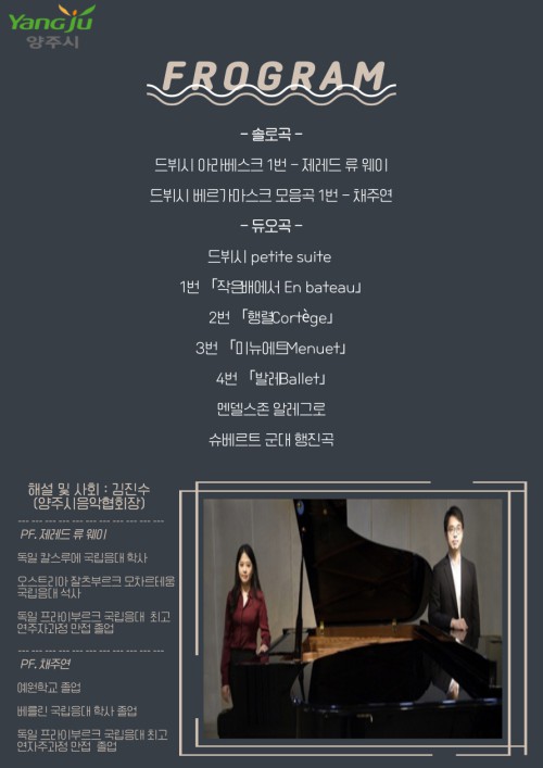 ¿¬ÁÖ°îÀº µåºß½ÃÀÇ ‘¾Æ¶óº£½ºÅ©1¹ø’,‘º£¸£°¡¸¶½ºÅ© ¸ðÀ½°î1¹ø’À» °¢ ÇǾƴϽºÆ®°¡ ¼Ö·Î°îÀ¸·Î ¿¬ÁÖÇϸç, µà¿À°îÀ¸·Î´Â µåºß½ÃÀÇ ‘petite suite(ÀÛÀº¸ðÀ½°î)’, ¸àµ¨½ºÁ¸‘¾Ë·¹±×·Î’, ½´º£¸£Æ®‘±º´ë ÇàÁø°î’ µîÀÌ ÀÖ´Ù.