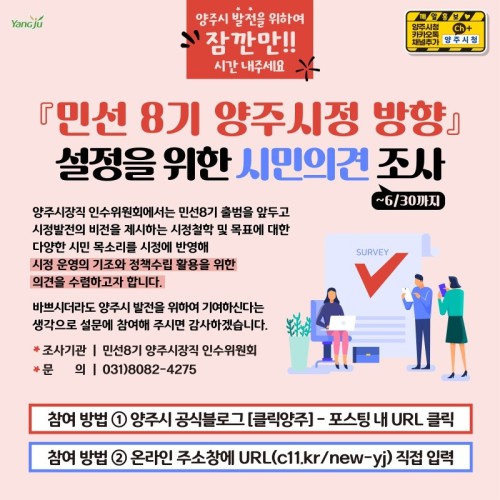 ÀμöÀ§´Â °¼öÇö ¾çÁÖ½ÃÀå ´ç¼±ÀÎÀÌ ¼±°Å °úÁ¤¿¡¼ Á¦½ÃÇÑ Á¤Ã¥ °ø¾à¿¡ ´ëÇØ ½Ã¹ÎÀÇ °ü½É°ú ¿ì¼±¼øÀ§¸¦ ÆÄ¾ÇÇÏ°í ½Ã¹ÎµéÀÇ ¸ñ¼Ò¸®°¡ ¹Ý¿µµÈ ½ÃÁ¤ ¿î¿µ ±âÁ¶, Á¤Ã¥°úÁ¦ ¼ö¸³À» À§ÇØ ‘¹Î¼± 8±â ¾çÁÖ½ÃÁ¤ ¹æÇâ ¼³Á¤À» À§ÇÑ ½Ã¹ÎÀÇ°ß Á¶»ç’¸¦ ½Ç½ÃÇÑ´Ù.