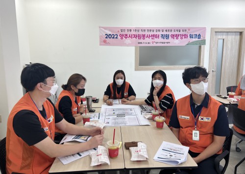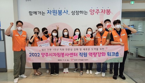 »ç)¾çÁÖ½ÃÀÚ¿øºÀ»ç¼¾ÅÍ(¼¾ÅÍÀå ±è¿ëÈÆ)´Â »ç´Ü¹ýÀÎ Ãâ¹ü 1ÁÖ³âÀ» ¸Â¾Æ ±×µ¿¾È Äڷγª19·Î ÀÎÇØ ħüµÇ¾ú´ø ÀÚ¿øºÀ»ç¸¦ ´õ¿í Ȱ¼ºÈ ½Ã۰í ÈûÂù µµ¾àÀ» À§ÇØ ÀÚ¿øºÀ»ç¼¾ÅÍ Á÷¿ø ¿ª·®°È ¿öÅ©¼óÀ» ÁøÇàÇß´Ù.