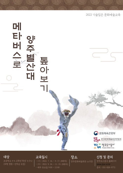 ¾çÁÖµµ½Ã°ø»ç´Â Çѱ¹¹®È¿¹¼úȸ°ü¿¬ÇÕȸ¿¡¼ ÁÖ°üÇÏ´Â '2022³â ±â¼ú ÀÔÀº ¹®È¿¹¼ú±³À°'¿¡ ¼±Á¤µÇ¾î ¿À´Â 7¿ù 16ÀϺÎÅÍ 11¿ù 19ÀϱîÁö “¸ÞŸ¹ö½º·Î ¾çÁÖº°»ê´ë Åì¾Æº¸±â”¶ó´Â ¹®È¿¹¼ú ±³À°ÇÁ·Î±×·¥À» ¿î¿µÇÑ´Ù°í ¹àÇû´Ù.