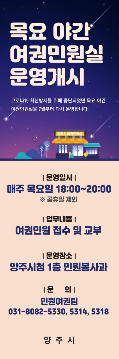 ¾çÁÖ½Ã(½ÃÀå °¼öÇö)´Â ¿À´Â 7ÀϺÎÅÍ Äڷγª19 È®»ê ¹æÁö¸¦ À§ÇØ ÀáÁ¤ Áß´ÜÇß´ø‘¸ñ¿ä ¾ß°£ ¿©±Ç¹Î¿ø½Ç’ ¿î¿µÀ» Àç°³ÇÑ´Ù°í ¹àÇû´Ù.