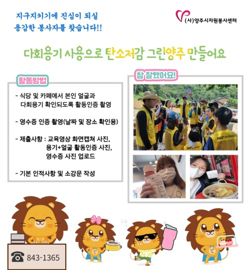 ÀÏȸ¿ëǰ ÁÙÀ̱â Ä·ÆäÀο¡ Âü¿©¸¦ Èñ¸ÁÇÏ´Â ½Ã¹ÎÀº 1365»çÀÌÆ® ¶Ç´Â ¾çÁÖ½ÃÀÚ¿øºÀ»ç¼¾ÅÍ È¨ÆäÀÌÁö¸¦ ÅëÇØ ½Åû °¡´ÉÇϸç, Âü¿©¿¡ °üÇÑ ¹®ÀÇ»çÇ×Àº ¾çÁÖ½ÃÀÚ¿øºÀ»ç¼¾ÅÍ(031-843-1365)·Î ÀüÈÇÏ¸é ¾È³»¹ÞÀ» ¼ö ÀÖ´Ù.