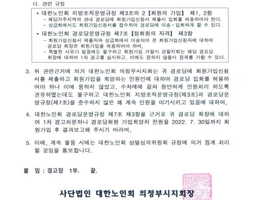 6¿ù30ÀϱîÁö ÀÌÇàµÇÁö ¾ÊÀÚ ÀÇÁ¤ºÎ ³ëÀÎȸ´Â 7¿ù5ÀÏ °æ°íÀåÀ» º¸³» “7¿ù30ÀϱîÁö Àü¿ø °¡ÀÔ Á¶Ä¡ÇÏÁö ¾ÊÀ¸¸é ´ëÇѳëÀÎȸ »ó¹ú½ÉÀÇÀ§¿øÈ¸ ±ÔÁ¤¿¡ µû¶ó ¡°è ó¸®Çϰڴٔ°í Å뺸Çß´Ù.