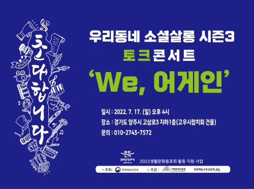 ¾çÁÖ½Ã(½ÃÀå °¼öÇö)´Â ¾çÁÖ ¹®È¿¹¼ú±³À°°øµ¿Ã¼ Ž(´ëÇ¥ ¹®¹ÌÁ¤)¿¡¼ Äڷγª19·Î ħüµÆ´ø ¾çÁÖÁö¿ªÀÇ »ýȰ¹®Èµ¿È£È¸ Ȱµ¿À» Ȱ¼ºÈÇϱâ À§ÇØ 2022 ¿ì¸®µ¿³× ¼Ò¼È»ì·Õ ½ÃÁð3 ‘WE, ¾î°ÔÀÎ’»ç¾÷À» ÆîÄ£´Ù.