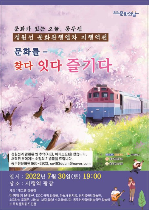 µ¿µÎõ½Ã(½ÃÀå ¹ÚÇü´ö)´Â ¿À´Â 7¿ù 30ÀÏ Åä¿äÀÏ ¿ÀÈÄ 7½Ã ÁöÇ࿪ ±¤Àå¿¡¼ µ¿µÎõ¹®È¿ø ÁÖ°üÀ¸·Î '°æ¿ø¼± ¹®È¿ÏÇà¿Â÷'¸¦ °³ÃÖÇÑ´Ù.