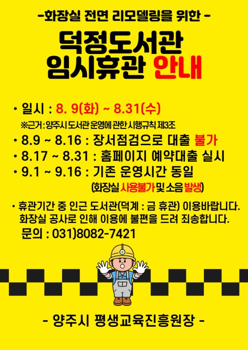 ¾çÁֽà ´öÁ¤µµ¼°üÀº ¿À´Â 9ÀϺÎÅÍ 8¿ù 31ÀϱîÁö ÈÀå½Ç ¸®¸ðµ¨¸µ °ø»ç¸¦ ½Ç½ÃÇϱâ À§ÇØ ÀÓ½ÃÈÞ°üÀ» ÇÑ´Ù°í ¹àÇû´Ù.