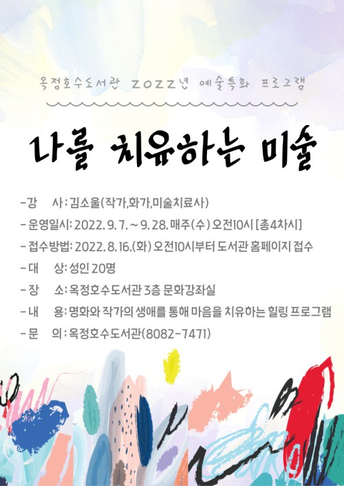 Ȱ¡ÀÌÀÚ ¹Ì¼úÄ¡·á»çÀÎ ±è¼Ò¿ï ÀÛ°¡°¡ °»ç·Î ³ª¼ ¼¼°è À¯¼öÀÇ ¹Ì¼úÀÛǰ°ú Ȱ¡µéÀÇ »îÀ» ÀÌÇØÇϱ⠽±°Ô ¼³¸íÇÏ°í ¼ö°ÀÚÀÇ ½É¸®»óÅÂ, °¨Á¤ µîÀ» ÆÄ¾ÇÇØ ½ºÆ®·¹½º ÇØ¼Ò¸¦ À§ÇÑ ¹Ì¼ú ½É¸®Ä¡·á¸¦ ÁøÇàÇÒ ¿¹Á¤ÀÌ´Ù.
