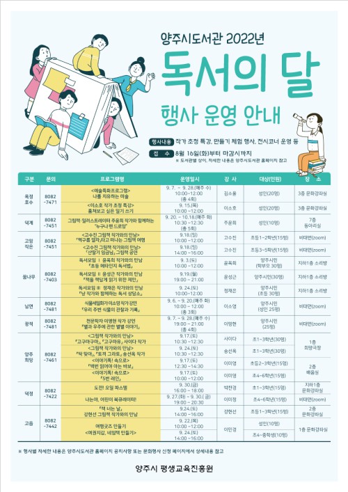 Âü¿© ½ÅûÀº ¿À´Â 16ÀϺÎÅÍ ¾çÁֽõµ¼°ü ȨÆäÀÌÁö(https://www.libyj.go.kr)¿¡¼ ¸¶°¨ ½Ã±îÁö Á¢¼ö¸¦ ÁøÇàÇϸç ÀÚ¼¼ÇÑ ³»¿ëÀº ȨÆäÀÌÁö °øÁö»çÇ×À» Âü°íÇϰųª °¢ µµ¼°ü¿¡ ÀüÈ·Î ¹®ÀÇÇÏ¸é ¾È³»¹ÞÀ» ¼ö ÀÖ´Ù.