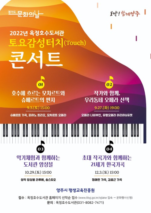 ¾çÁֽà ¿ÁÁ¤È£¼öµµ¼°üÀº 2022³â ‘°æ±âµµ ¹®ÈÀÇ ³¯’ ÁÖ°£¿¡ ½Ã¹Îµé¿¡°Ô ´Ùä·Î¿î ¹®ÈÇà»ç üÇè ±âȸ¸¦ Á¦°øÇϱâ À§ÇØ ¿À´Â 9¿ùºÎÅÍ 12¿ù±îÁö ‘Åä¿ä°¨¼ºÅÍÄ¡(Touch) ÄܼƮ’¸¦ ¿î¿µÇÑ´Ù.