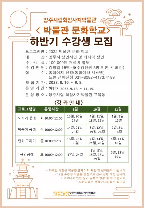 ¾çÁֽø³È¸¾Ï»çÁö¹Ú¹°°üÀº ½Ã¹ÎÀÇ ¹®È¿¹¼ú ÇâÀ¯ ±âȸ Á¦°øÀ» À§ÇØ ¼ºÀδë»ó ±³À°ÇÁ·Î±×·¥ ‘2022 ¹Ú¹°°ü ¹®ÈÇб³’ Âü¿©ÇÒ ÇϹݱ⠼ö°»ýÀ» ¸ðÁýÇÑ´Ù.