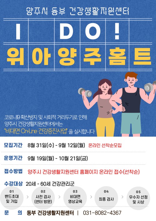 ¾çÁֽà °Ç°»ýȰÁö¿ø¼¾ÅÍ´Â ¿À´Â 31ÀϺÎÅÍ 9¿ù 12ÀϱîÁö ‘I DO! À§¾Æ ¾çÁÖ È¨Æ®’ 1±â Âü°¡ÀÚ 50¸íÀ» ¼±Âø¼øÀ¸·Î ¸ðÁýÇÑ´Ù.