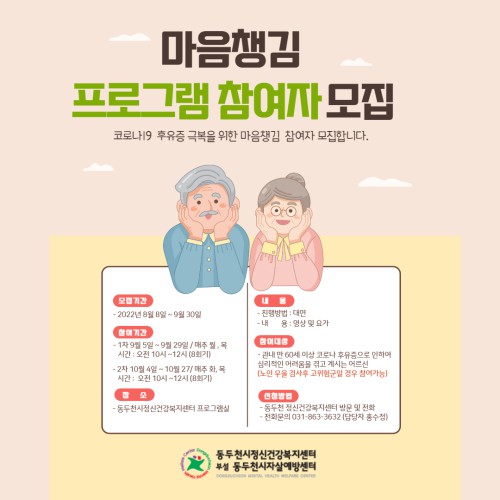µ¿µÎõ½ÃÁ¤½Å°Ç°º¹Áö¼¾ÅÍ¿¡¼´Â Äڷγª ÈÄÀ¯ÁõÀ¸·Î Èûµé¾îÇÏ´Â ¾î¸£½ÅÀ» ´ë»óÀ¸·Î ¿ì¿ï ¹× ºÒ¾È, ½ºÆ®·¹½º¸¦ ¿ÏÈÇϱâ À§ÇÑ “¸¶À½Ã¬±è” ÇÁ·Î±×·¥À» ÁøÇàÇÑ´Ù.